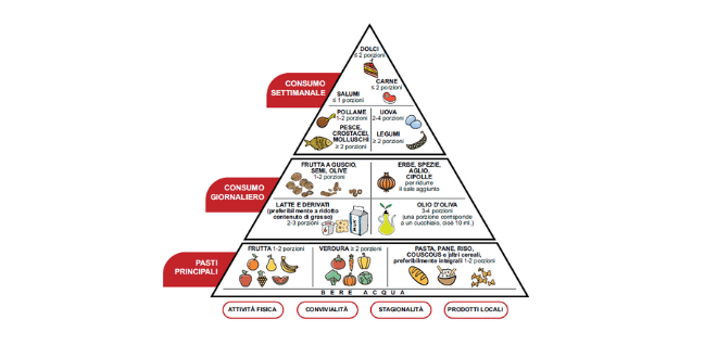 Oltre agli alimenti, questa piramide prende in considerazione altri fattori, come per esempio l’attività fisica, che riguardano lo stile di vita e per questo importanti in un’ottica di prevenzione o come l’esortazione a scegliere prodotti locali, che includono anche il concetto di sostenibilità.