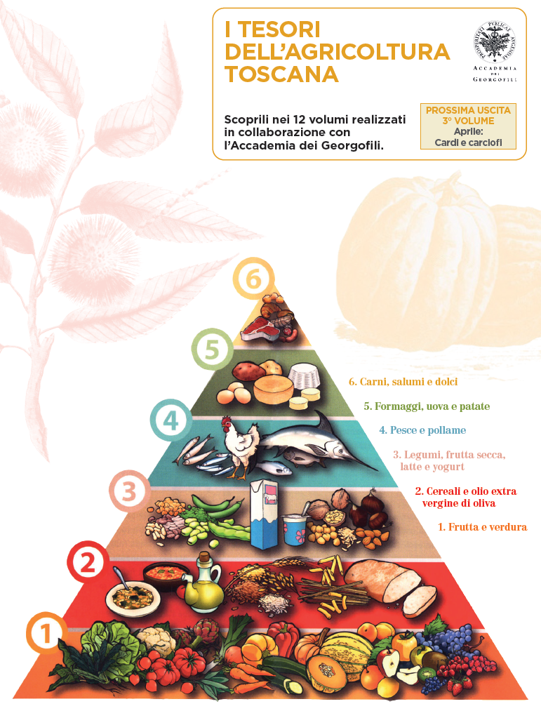 Sul retro la grande Piramide Alimentare Toscana® ideata nell’ambito della Regione Toscana, una guida nutrizionale affidabile, aggiornata, intuitiva.