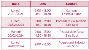 Al fine di esaudire le richieste dei colleghi, la 2a edizione partirà con il primo appuntamento presso il Campus di Lastra a Signa: le restanti sedi verranno comunicate successivamente tramite locandine, volantini e avviso sulla Intranet aziendale.