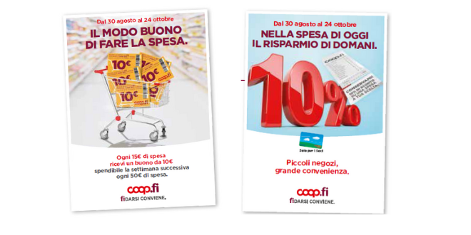Nel periodo dal 30 agosto al 24 ottobre, la prima settimana, per ogni spesa uguale o superiore a 15€ e multipli, il cliente matura un buono da 10€ da spendere la settimana successiva ogni 50€ e multipli di spesa. Questa attività si svolgerà nei Grandi Superstore, nei Superstore e Super Maggiori. Il punto vendita di fruizione potrà essere differente da quello di erogazione, ma deve essere sempre appartenente ai negozi oggetto dell’iniziativa.