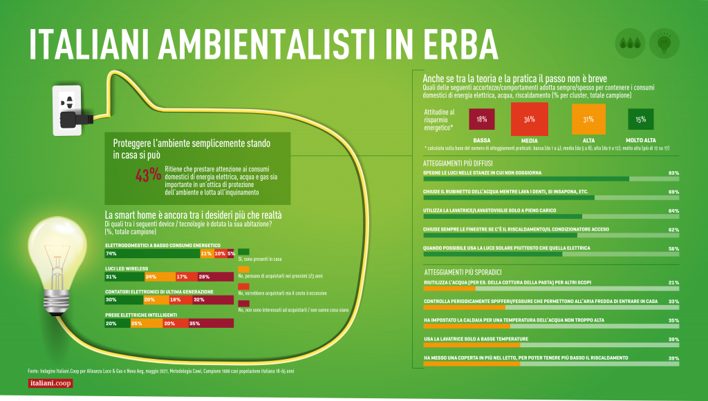 Gli italiani, infatti, si dichiarano molto attenti e rispettosi dell’ambiente quando si tratta di consumi energetici casalinghi: 4 su 10 sono convinti che prestare attenzione proprio ai consumi domestici di acqua, luce e gas sia uno dei modi migliori per preservare l’ambiente, preceduto solo dal fare la raccolta differenziata. Ben 8 intervistati su 10 dichiarano di spegnere le luci se non sono in una stanza; si chiude il rubinetto mentre ci si lavano i denti o ci si insapona in 7 case su 10; oltre la metà ha assunto abitudini virtuose come utilizzare la lavatrice e la lavastoviglie solo a pieno carico, chiudere le finestre se il riscaldamento o il condizionatore sono accesi, usare la luce solare invece di quella elettrica quando possibile.
