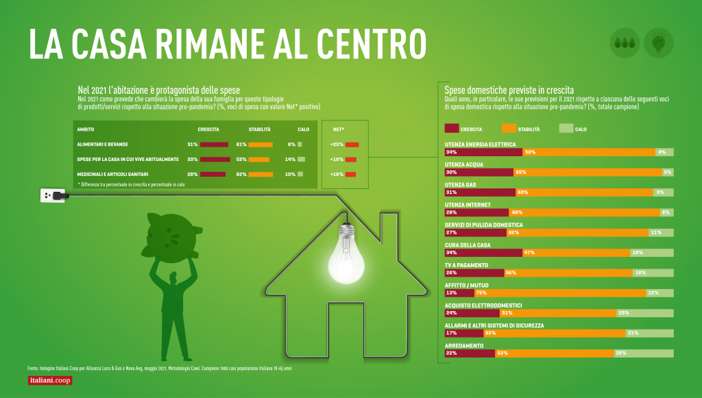 Quasi nove italiani su 10 hanno sentito parlare del superbonus del 110% varato dal governo, ma solo la metà pensa di usufruirne. In effetti le migliorie alla casa hanno un ruolo sempre più centrale anche nelle spese familiari: la smart home è ancora un desiderio, più che una realtà, ma ben il 34% degli italiani conta di spendere di più in energia elettrica e nella cura della casa, contro appena il 13% che lo farà per affitti e mutui.