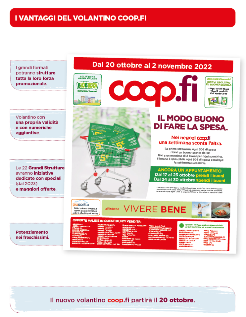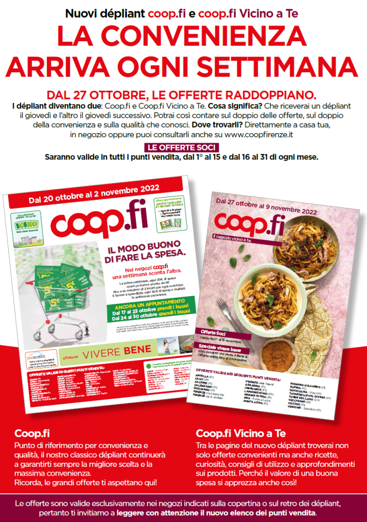 - Questo permetterà ai Soci di ricevere un dépliant il giovedì e l’altro il giovedì successivo, potendo contare così sul doppio delle offerte, sul doppio della convenienza e sulla qualità di Coop.