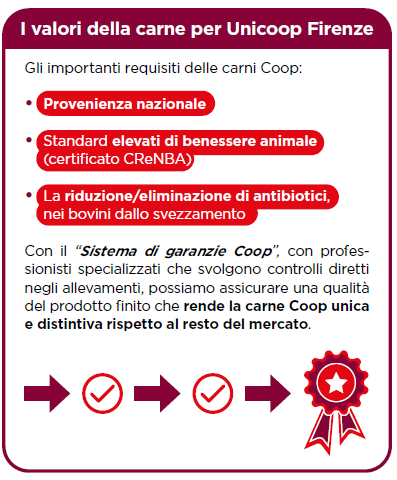 Con questa azione Unicoop Firenze ha raggiunto un traguardo unico tra le cooperative: vendere ai propri Soci carne a Marchio completamente italiana, in tutte le categorie: bovini, suini e avicunicoli provenienti da capi nati e allevati in Italia.