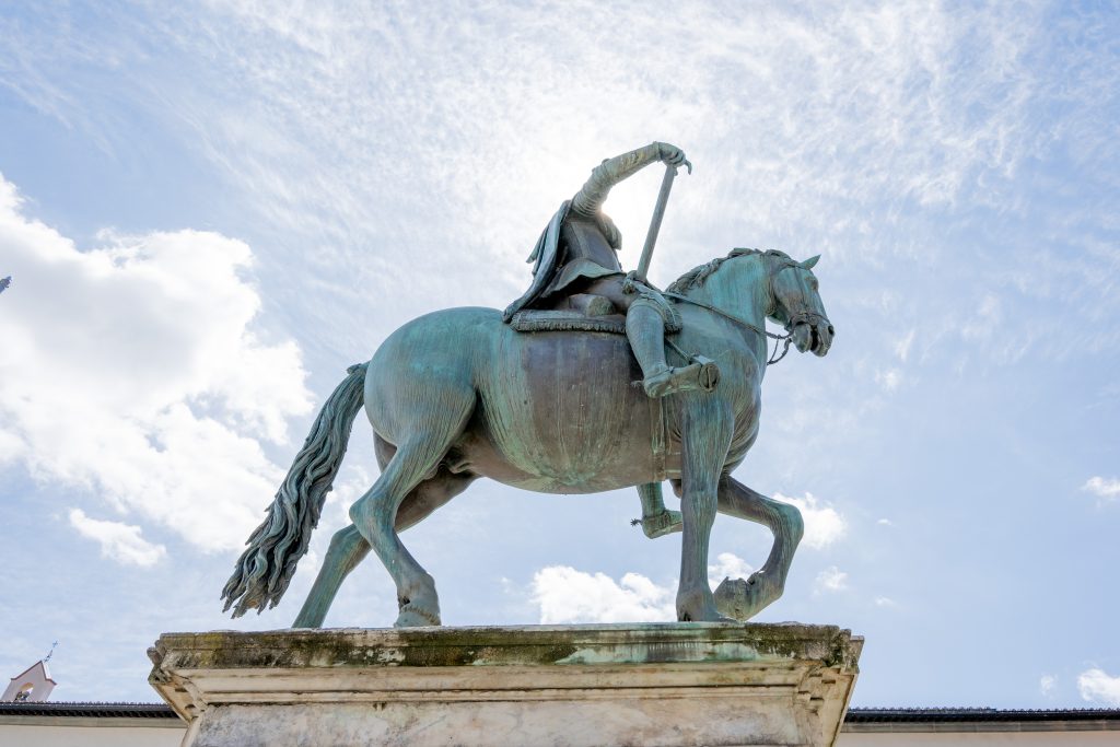 Il monumento equestre al centro, con il bronzo rappresentante Ferdinando I de’ Medici, opera dello scultore Giambologna, è come abbracciato su tre lati da porticati che incorniciano la vista sulla cupola del Duomo di Firenze di Filippo Brunelleschi.