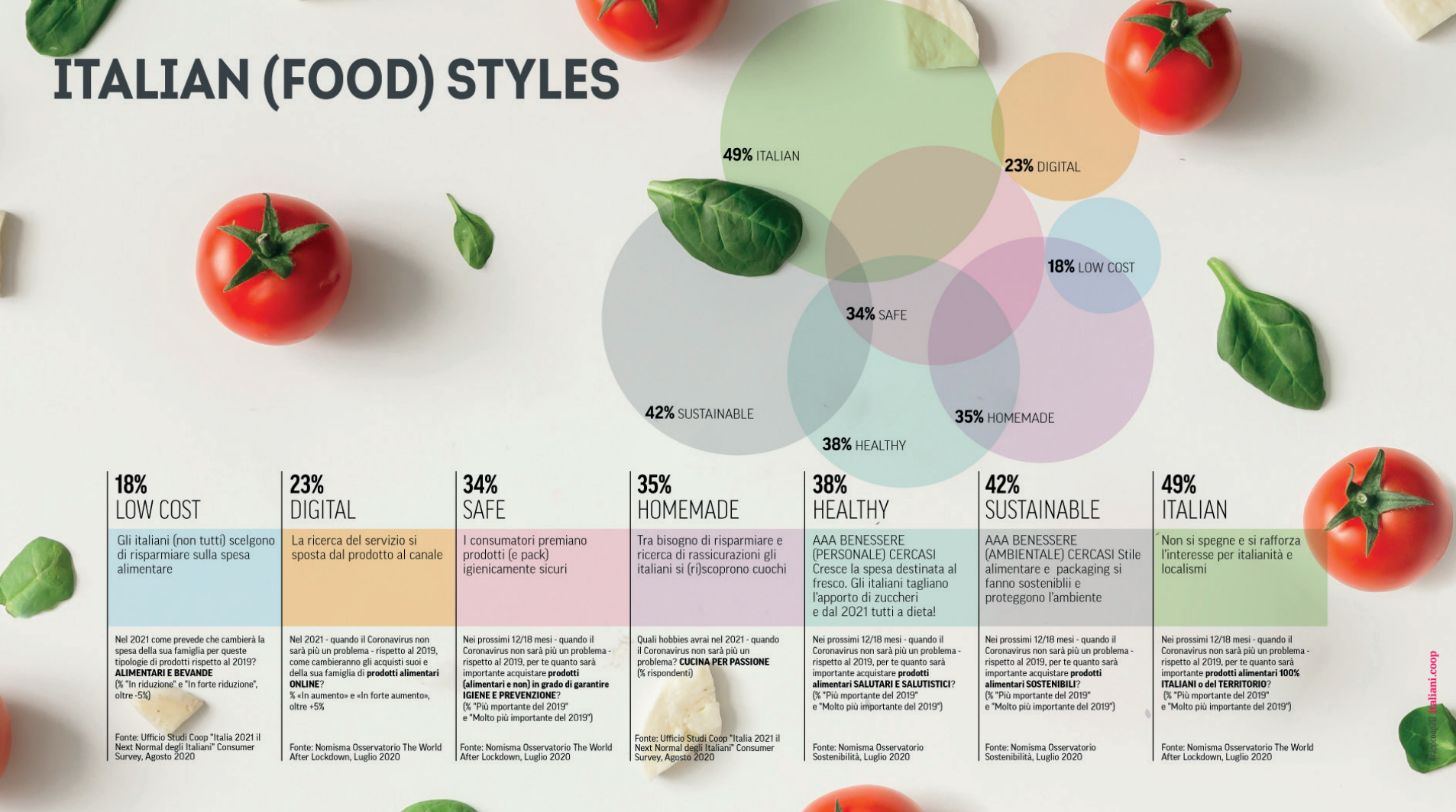 La casa come salvagente a cui tenersi stretti fa il paio con un’altra costante che distingue ancora nel postcovid gli italiani dai cugini europei: il cibo. Alla spesa alimentare, pur nell’emergenza e in una evidente contrazione generalizzata degli acquisti, gli italiani non rinunciano e solo il 31% dichiara di voler acquistare prodotti di largo consumo confezionato più economici; un dato decisamente inferiore al 50% registrato lo scorso anno.