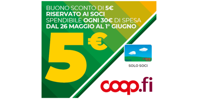 Dal 19 al 25 maggio, in tutti i punti vendita Unicoop Firenze, i Soci che acquisteranno prodotti dei nostri valori (di aziende toscane, ecologici, biologici, frutta e verdura fresche e Prodotti a Marchio Coop) contrassegnati dal cartellino rosso “Una Buona Spesa” riceveranno ogni 15€ un buono sconto da 5€, che la settimana successiva (dal 26 maggio al 1° giugno) potrà essere utilizzato ogni 30€ di spesa e multipli.