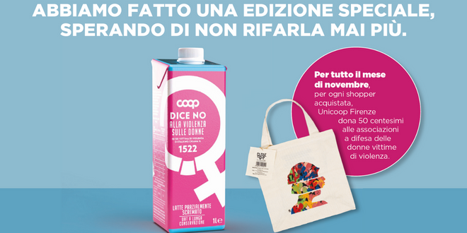 Nel periodo dell’iniziativa, in tutti i supermercati Coop in Toscana, sul latte parzialmente scremato Coop, in edizione speciale rosa, è stato stampato il numero unico antiviolenza e antistalking 1522. Inoltre, acquistando il prodotto, si è potuto contribuire a sostenere i centri antiviolenza attivi in Toscana.