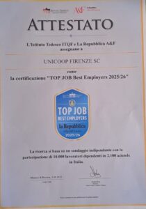 Unicoop Firenze è tra le imprese che hanno ricevuto la certificazione Top job best employers 2025 – 2026.