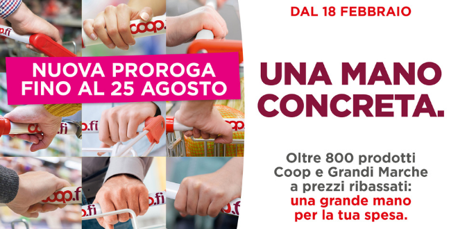 Nei nostri punti vendita prosegue l’iniziativa “Una mano concreta”: 800 prodotti a prezzi ribassati fino al 25 agosto. Lo sconto riguarda sia prodotti di Grandi Marche che a marchio Coop, per un messaggio di convenienza e qualità trasversale.