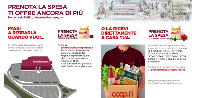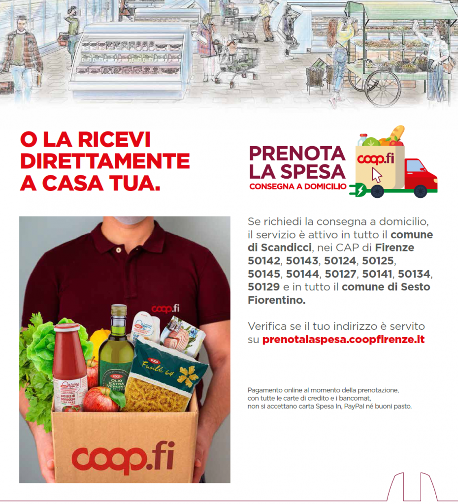 Il servizio continuerà anche con la riapertura del punto vendita di Ponte a Greve, allargando gli indirizzi di consegna a domicilio, il servizio è attivo in tutto il comune di Scandicci, nei CAP di Firenze 50142, 50143, 50124, 50125, 50145, 50144, 50127, 50141, 50134, 50129 e in tutto il comune di Sesto Fiorentino.
