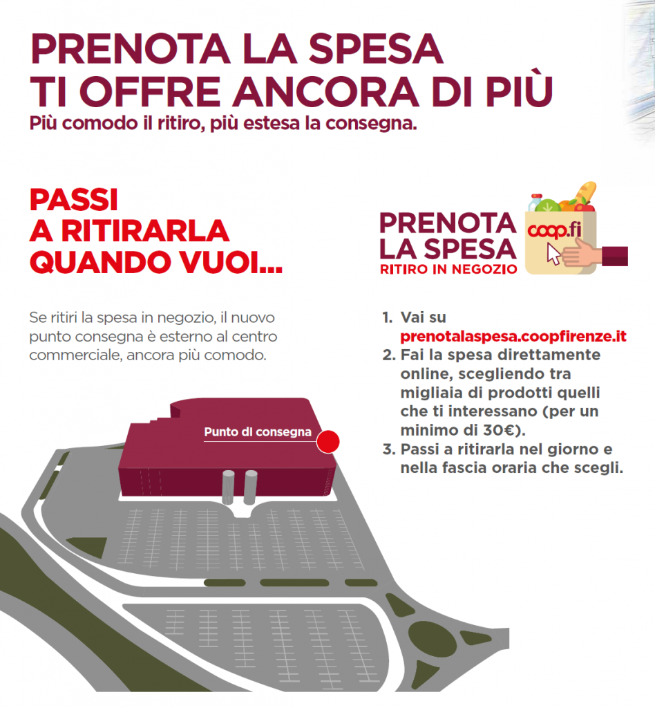 In questi mesi per limitare il disagio dei Soci e clienti del punto vendita di Ponte a Greve è stato messo a disposizione un servizio di consegna della spesa a domicilio utilizzabile attraverso il sito prenotalaspesa.coopfirenze.it. Collegandosi al sito è stato possibile fare la spesa e decidere se riceverla direttamente al proprio indirizzo, oppure se passare a ritirarla in negozio.