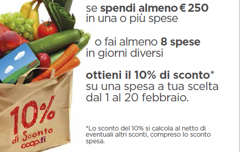 Fino al 31 gennaio i Soci hanno avuto diritto all’erogazione di un singolo buono sconto se raggiungevano delle specifiche soglie di spesa in uno dei nostri punti vendita Coop.fi o su Piùscelta. La soglia da raggiungere era 250 euro in una o più spese oppure 8 spese di qualsiasi importo fatte in giorni diversi.