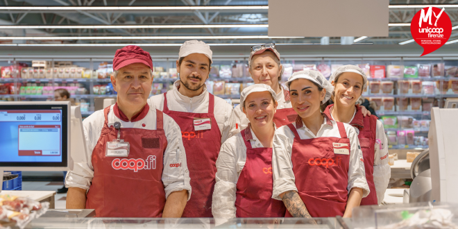 Alcuni colleghi del reparto Gastronomia e Rosticceria del Superstore di Pistoia. Da sinistra Massimo Meucci, Caporeparto. Dietro, da sinistra Francesco Chironi, Michela Mazzoncini, Adriana Magi. Davanti, da sinistra Veronica Settesoldi, Elisa Baldi.