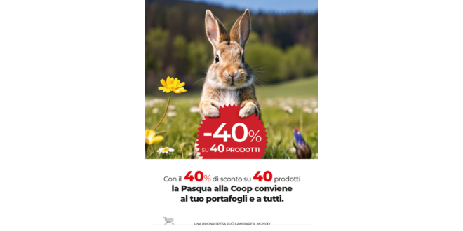 Dal 10 al 19 aprile, in occasione della Pasqua avremo la promozione “40 prodotti al 40% di sconto”! Promozione valida in tutta la rete di vendita eccetto le Superettes.