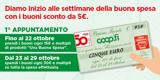 Dal 16 ottobre, in tutti i punti vendita Unicoop Firenze, con cadenza settimanale i Soci e i clienti che acquisteranno prodotti dei nostri valori (Una Buona Spesa) riceveranno ogni 15€ un buono sconto da 5€, che la settimana successiva potrà essere speso ogni 30€ su tutta la spesa.