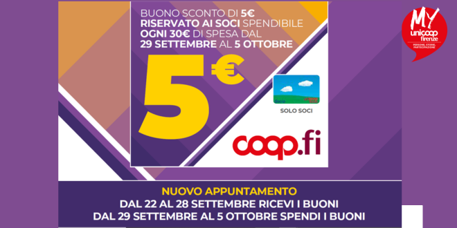 Dal 22 al 28 settembre i Soci che acquisteranno prodotti della “Buona Spesa” riceveranno ogni 15€ un buono sconto da 5€, che la settimana successiva, dal 29 settembre al 5 ottobre, potrà essere utilizzato ogni 30€ di spesa, su tutti i prodotti.