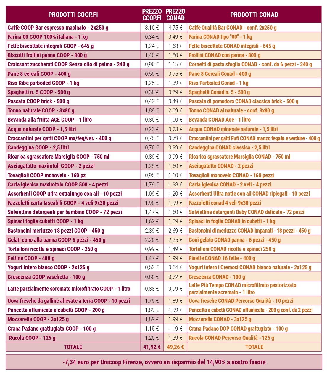 Per l’acquisto di una confezione di ciascun prodotto, il consumatore presso un punto vendita Conad (stando ai prezzi pubblicati) spende 126,40 euro. La stessa spesa nei negozi Unicoop Firenze (dai minimercati ai grandi supermercati il prezzo è uguale) costa 109,54 euro, con un risparmio di 16,89 euro pari al 13,3%. Di questi 96, abbiamo scelto e confrontato 34 prodotti significativi di una spesa quotidiana. Il risultato lo trovate nella tabella sottostante.