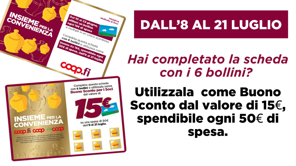 Ogni scheda completata con 6 bollini diventa un Buono Sconto che dovrà essere consegnato in cassa, oppure all’assistente alle casse semi-assistite e Salvatempo, necessariamente insieme alla carta Socio.